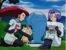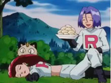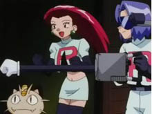 Fangs for Nothin'! Old Oldie declares that Ash and Claire will have the use of three Pokemon each, with only Ash allowed to substitute out his Pokemon. Brock seems to be surprised that Ash's final battle will be his most difficult (wow, no shit) and when Misty agrees that it is going to be tough, Brock just suddenly declares that things will be fine. Claire calls out a Kingdra and Ash must be having a good day, because he has retained the memory that Kingdra evolves from a Seadra, which is a Water Type. Therefore, Pikachu will surely have the type advantage over it. The battle kicks off immediately, Pikachu hitting Kingdra directly with a Thunderbolt. The massive Sea-Horse/Dragon grits its teeth and squints its eyes, then throws off the attack much to the twerps¹ surprise. Kingdra fires up a blast of wind into a Twister which Pikachu quickly dodges, but Kingdra isn't done yet and actually controls the wind funnel, chasing Pikachu and hitting it. Pikachu crashes down, then jumps angrily back up blasts back with Thunder, but again nothing happens. Ash accusingly demands to know what is the deal, why aren't Pikachu's moves working. Hax? Claire points out the fact that Kingdra used twister, a Dragon Attack, and Brock comes to the realisation that Kingdra gained Dragon traits when it evolved. Claire explains the Water Characteristics might be a weakness against Pikachu's electric attacks, but that is more than made up for by its Dragon Characteristics. Old Oldie does try to placate the hurt though, noting that Pikachu is showing surprising resilience. Claire agrees, saying it has gained her respect, and then orders Hydro Pump to finish off. Ash counters with Thunderbolt which turns the Hydro-Pump to smoke and Claire congratulates him on a clever tactic, but Ash doesn't glory in the compliment as he worries about the fact that he doesn't seem to be having any impact on her Pokemon. Elsewhere, Jesse lies on her back (hey hey!) moaning about the evolution of "her" cute little Dratini. Meowth pops his face into her view thinking he'll fulfil her cute Pokemon desire, but she snaps back at him and goes back to staring at nothing. James knows how to get her out of her grump though, offering her a plate of jelly doughnuts, which gets her up on her knees and smiling (a pose wasted on James). She complains about Claire ruining her hopes and dreams and vows to make her pay and James and Meowth ask her what her plans to steal Dragonair are. "Dratinis rule and Dragonairs are for fools!" snaps Jesse angrily; James and Meowth pratfalling before Meowth starts yelling at her for being so detached from reality. His tail slaps at the doughnuts as from behind a bush, a vaguely Wobbuffet-like Pokemon pokes out for a peek. As Jesse yells at James and Meowth that she wanted a Dratini to keep her warm on cold Winters night (oh my), Wobbuffet looks down and realises that all of the doughnuts are suddenly gone, and looks about in confusion as James shows Jesse and Meowth a picture of the Dragon Fang. He tells Jesse and Meowth it is worth a lot and certainly worth stealing, and Jesse agrees this would be a rewarding way of teaching Claire a lesson. She grabs for a doughnut only to find they're all gone, and demands to know who took them. "Not me!" gasps James, "That jelly goes right to my thighs!" "And I'm on a low carb diet!" gasps Meowth. "Wynaut!" yells not-Wobbuffet, causing Team Rocket to cast accusing glares at Wobbuffet. It insists it is innocent but they ignore it, roaring at for being greedy as it sweat drops in horror. Back at the battle, Ash tries a different tack and has Pikachu use physical attacks on Kingdra, which also fail to do nothing. Misty and Brock suggest he try a different tactic with a different Pokemon, since he IS allowed to substitute Pokemon. Nothing else is working, so Ash figures why not and calls out Noctowl, maybe hoping that where his fat yellow rat failed, his drug dealing shiny Noctowl will work. Meanwhile Team Rocket have sneak their way into the Gym grounds and notice a padlocked shed, and Meowth pops a claw to get them in. At the battle, Noctowl dodges Kingdra¹s Hydro Pumps and uses Confusion to lift the surprised Dragon-Type into the air and send it flying towards a wall. Kingdra fights back though by using Hydro Pump to propel itself away from the wall and land safely, so Noctowl tries to freeze it in place using hypnosis. Kingdra uses Agility to dart from place to place and since Noctowl can't make eye contact, it can't hypnotise it. Inside the now unlocked shed, Team Rocket sees the box containing the Dragon Fang and prepares to grab it, thinking it is almost too easy. James yells at them to stop and pops on a pair of sunglasses that reveal a SHITLOAD of lasers surrounding the box. Jesse and Meowth moan that they're so close but so far, until James brings out Handy Andy! But no, it's not a shirtless blonde with loose morals, but a hand on a box that extends out under James' control, sliding around the lasers as Jesse eagerly shouts directions... until Meowth points out that she can't actually see the lasers. As James reaches the box moaning for Andy to be steady (Oh James), Jesse asks what he and Andy will do if the box turns out to be empty? James says they'll probably both break down and cry and so Jesse suggests he open it up first to make sure before dragging it back. Back at the battle, Kingdra knocks Noctowl down with a Hydro Pump. Brock gasps that he never thought the battle would be THIS hard while Claire notes that once a Pokemon gains Dragon characteristics, it gains all sorts of strengths you'd never expect. She almost condescendingly notes to Ash that he must have known this would be a tough battle, and then tells Kingdra to finish Noctowl off with Hydro Pump, and Ash gasps out for the still prone Noctowl to try to get out of the way. Handy Andy opens the box and reveals the Dragon Fang, and Team Rocket gasp in delight, their dreams are about to come true and Clai